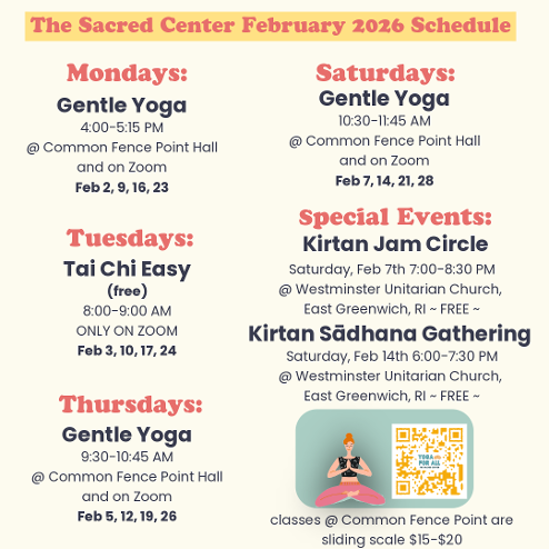 We are an inclusive, life affirming, interfaith, online and local learning community on Aquidneck Island in Rhode Island devoted to helping people find their sacred center within. With this as our intention, we offer gentle yoga, tai chi easy form, medical qigong, meditation and kirtan (group chanting).